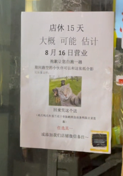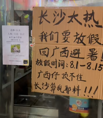 8月1日店铺正式放假,王先生于8月2日自驾回到广西,“现在在南宁,没长沙那么热。”据了解,目前店铺外张贴的通知上写的是放假至8月15日,“15号我会先过来,到时候先看看天气怎么样,如果还是很热,也不排除会不会临时延长假期,如果说不是很热的话,可能16号就营业了。”
