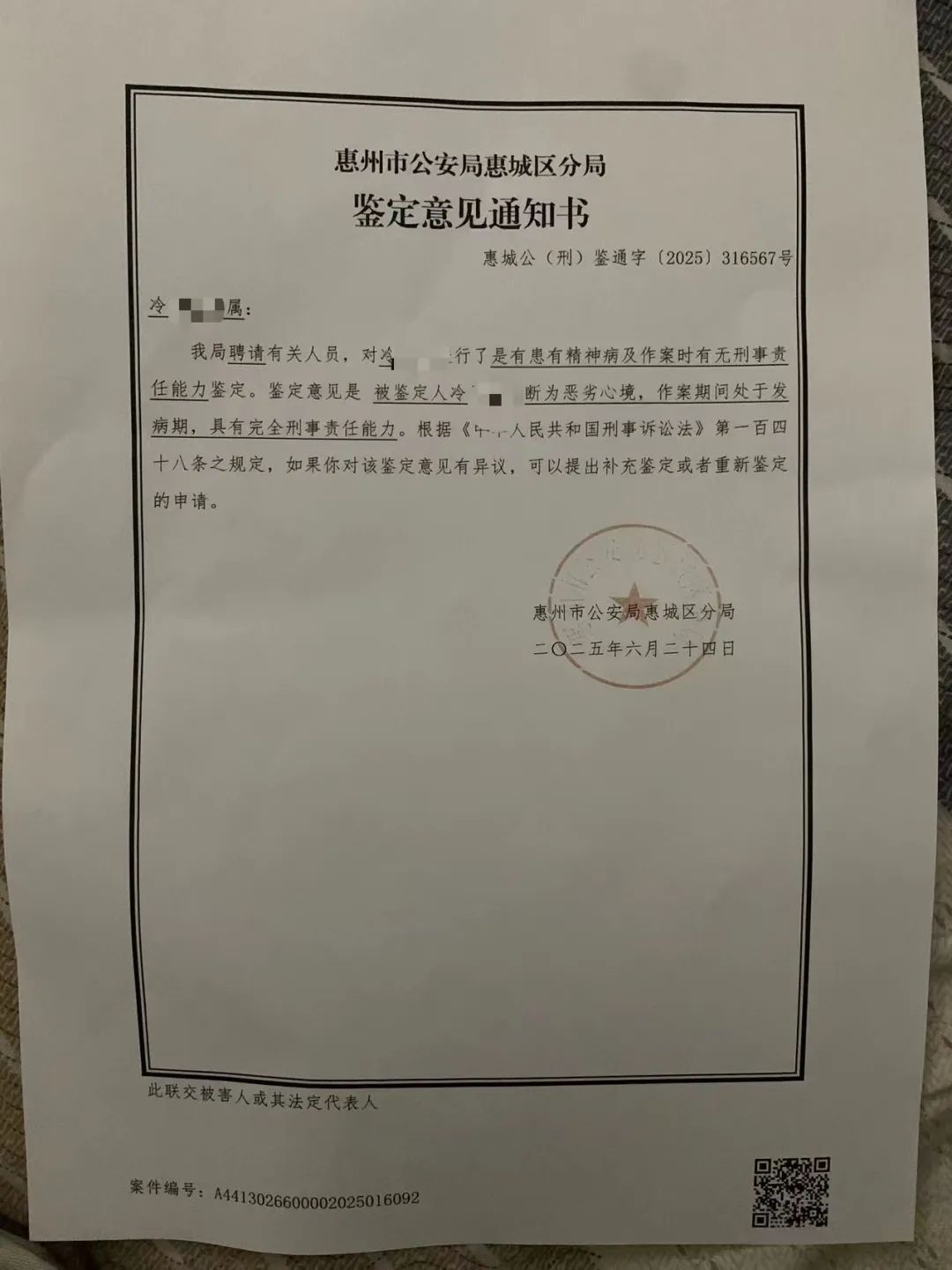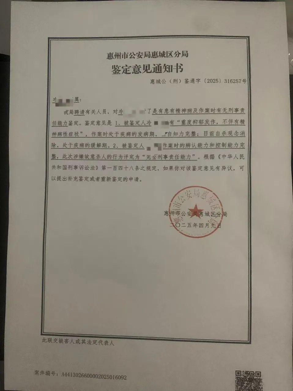 因为与哥哥冷某敏并没有什么矛盾,冷先生为了弄清楚原因,申请了对冷某敏进行精神鉴定。冷某敏先后做了两次精神鉴定。鉴定意见通知书显示,冷某敏首次鉴定为“重度抑郁症发作,不伴有精神病症状”,第二次鉴定为“恶劣心境”;两次鉴定结果冷某敏均处于发病期,但具有完全刑事责任能力。