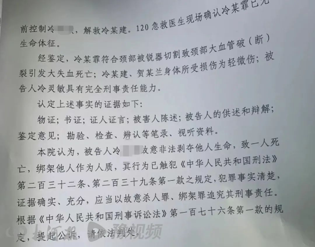 冷某敏的作案并非临时起意。被害人家属提供的检方起诉书显示,被告人冷某敏因工作、生活受挫,长期情绪低落、焦虑,萌生自杀念头。2025年1月29日0时许,年夜饭后,冷某敏趁房间只有父母和侄女时,从随身携带的小包中拿出刀具伺机对侄女冷某霏行凶,因侄女挣扎哭闹,被母亲贺某兰发现。冷某敏划伤贺某兰双手,并将贺某兰推出房外并反锁房门。随后,贺某兰下楼向保安求助并报警。其间,冷某敏对侄女行凶后,反锁大门,又将醒来查看情况的父亲冷某建用刀具挟持到阳台。1时42分,出警人员成功破门进入房内,经多方劝说,冷某敏仍然不放弃犯罪且情绪愈加激动。3时许,警方趁机控制冷某敏,并解救冷某建。120急救医生现场确认冷某霏已无生命体征。