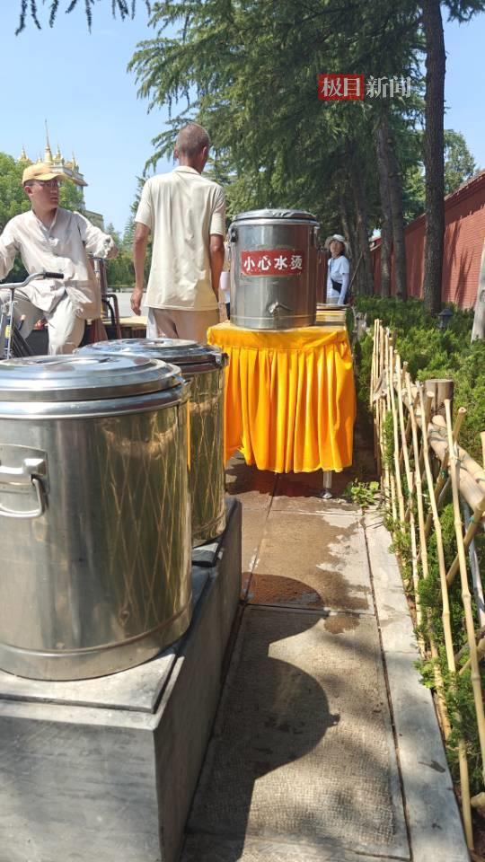 寺院内,一直有一辆满载饮水桶的三轮车穿梭其中,义工们将饮完的水桶装满冰水再放回原处。据工作人员介绍,一天下来,他们要供应60多桶水,其中有冰水,也有温水。有些供应点刚换不久就喝完了。