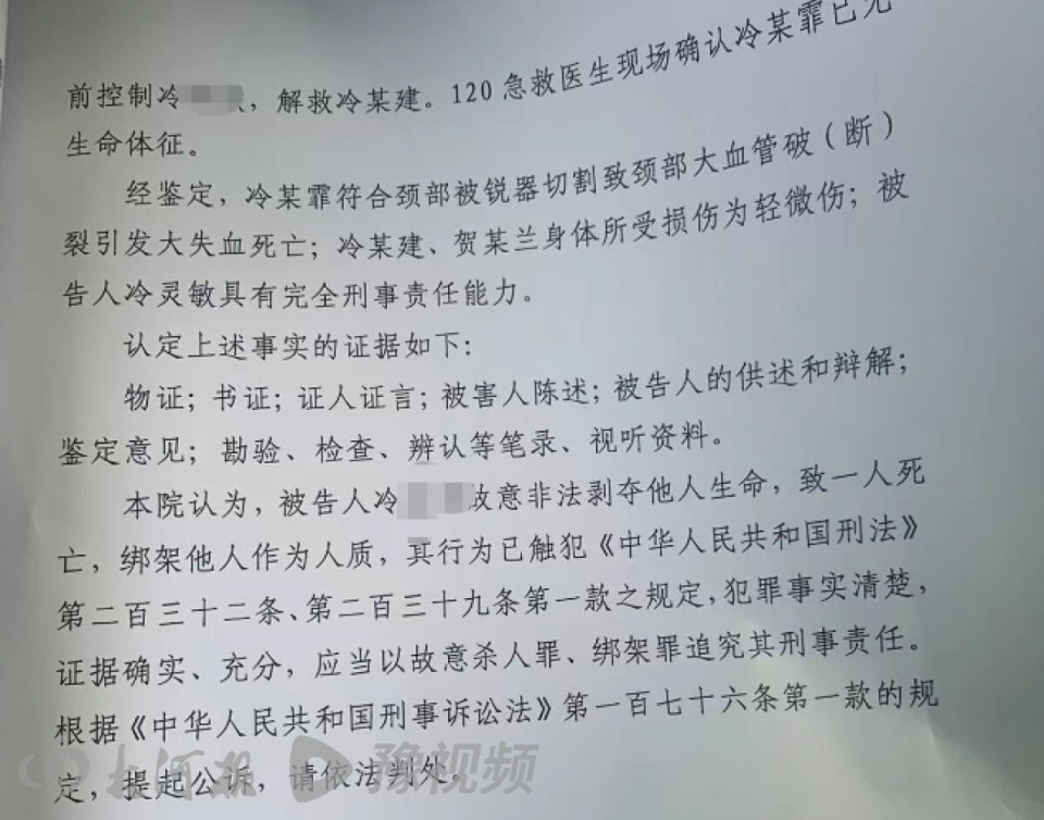 冷某敏的作案并非临时起意。被害人家属提供的检方起诉书显示,被告人冷某敏因工作、生活受挫,长期情绪低落、焦虑,萌生自杀念头。2025年1月29日0时许,年夜饭后,冷某敏趁房间只有父母和侄女时,从随身携带的小包中拿出刀具伺机对侄女冷某霏行凶,因侄女挣扎哭闹,被母亲贺某兰发现。冷某敏划伤贺某兰双手,并将贺某兰推出房外并反锁房门。随后,贺某兰下楼向保安求助并报警。其间,冷某敏对侄女行凶后,反锁大门,又将醒来查看情况的父亲冷某建用刀具挟持到阳台。1时42分,出警人员成功破门进入房内,经多方劝说,冷某敏仍然不放弃犯罪且情绪愈加激动。3时许,警方趁机控制冷某敏,并解救冷某建。120急救医生现场确认冷某霏已无生命体征。