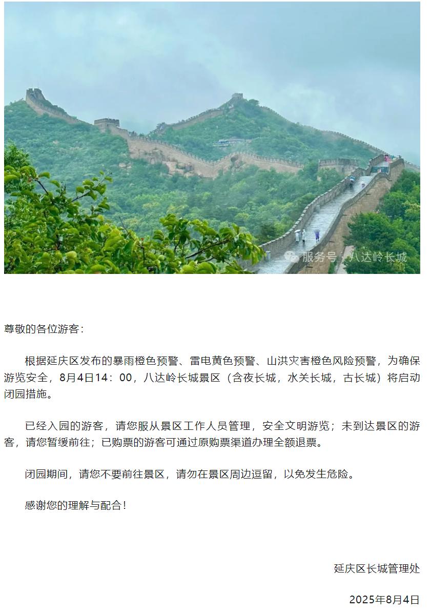 根据延庆区发布的暴雨橙色预警、雷电黄色预警、山洪灾害橙色风险预警,为确保游览安全,8月4日14:00,八达岭长城景区(含夜长城,水关长城,古长城)将启动闭园措施。