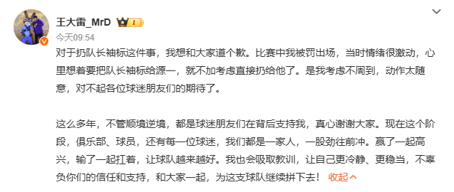 对于扔队长袖标这件事,我想和大家道个歉。比赛中我被罚出场,当时情绪很激动,心里想着要把队长袖标给源一,就不加考虑直接扔给他了。是我考虑不周到,动作太随意,对不起各位球迷朋友们的期待了。这么多年,不管顺境逆境,都是球迷朋友们在背后支持我,真心谢谢大家。现在这个阶段,俱乐部、球员,还有每一位球迷,我们都是一家人,一股劲往前冲。赢了一起高兴,输了一起扛着,让球队越来越好。我也会吸取教训,让自己更冷静、更稳当,不辜负你们的信任和支持,和大家一起,为这支球队继续拼下去!