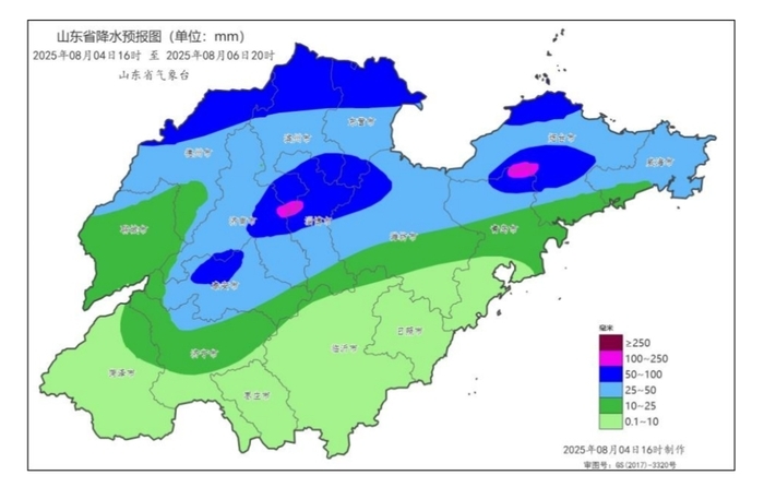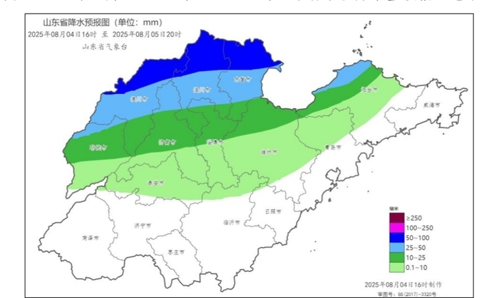 山东省气象台于8月4日16时发布暴雨蓝色预警:受副高边缘暖湿气流和冷空气共同影响,4日傍晚到6日白天我省有一次大范围降雨天气过程,并伴有雷电、短时强降水和7~9级局部10级以上雷雨大风。全省平均降水量20~30毫米,其中,鲁西北、鲁中和半岛地区30~40毫米局部100毫米以上,其他地区5~15毫米局部30毫米以上,最大小时降水量40~70毫米。