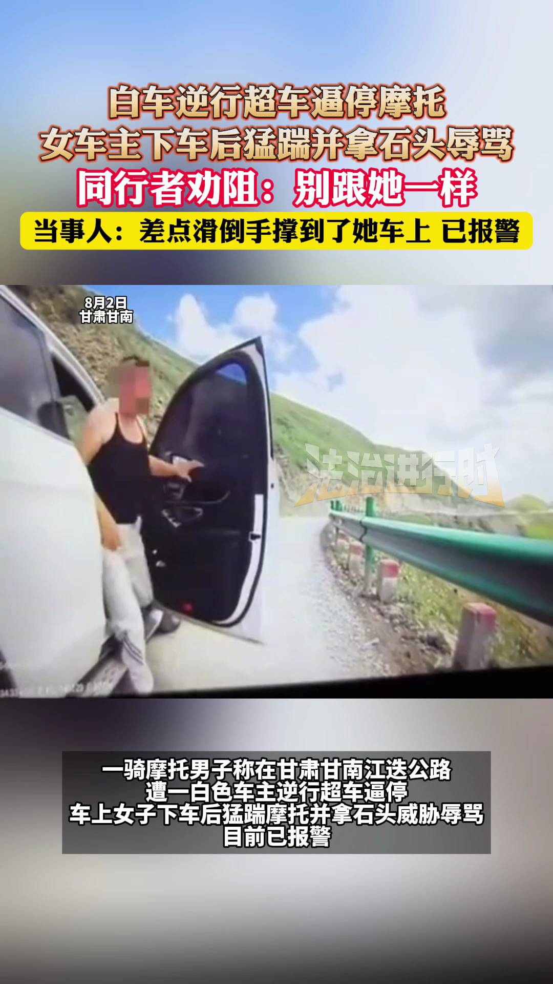 女司机疑嫌摩托车主拍车,下车猛踹后捡起石块