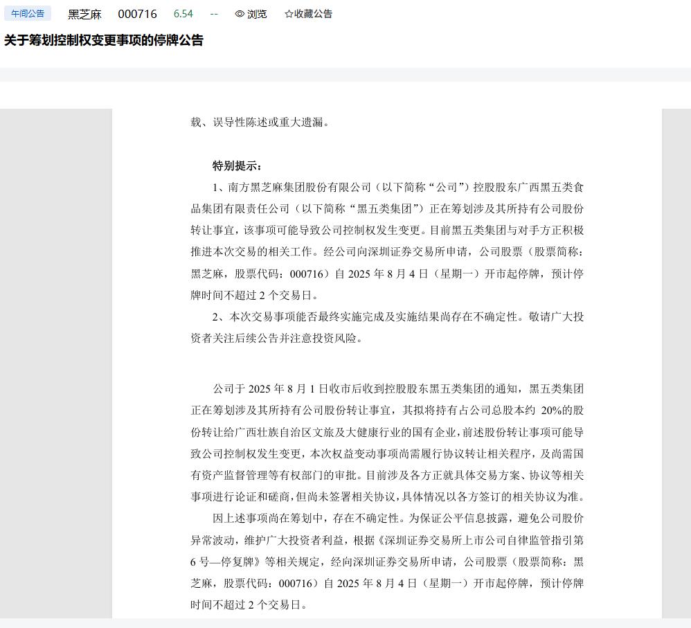 8月4日午间,黑芝麻公告,公司于8月1日收市后收到控股股东广西黑五类食品集团有限责任公司的通知,黑五类集团正在筹划涉及其所持有公司股份转让事宜,其拟将持有占公司总股本约20%的股份转让给广西壮族自治区文旅及大健康行业的国有企业,前述股份转让事项可能导致公司控制权发生变更。公司股票自8月4日开市起停牌,预计停牌时间不超过2个交易日。