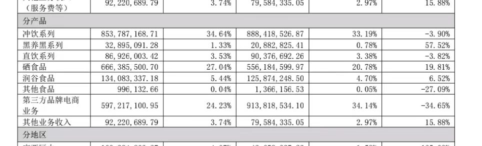 数据显示,2015年黑芝麻糊类产品销量约为900万件。自2021年起,黑芝麻将糊类产品拆分为“冲饮类”和“直饮类”,其中公司拳头产品袋装黑芝麻糊归属于冲饮类。到2024年,直饮类与冲饮类产品合计销量跌为529.86万件,两类产品收入合计仅占公司总营收的38.17%。