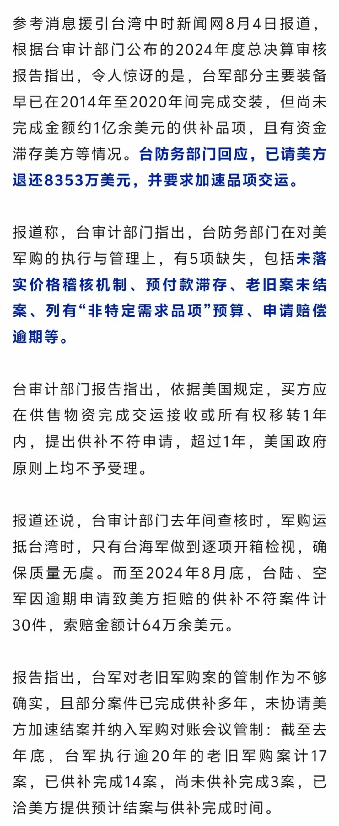 台军方:已请美方退8353万美元