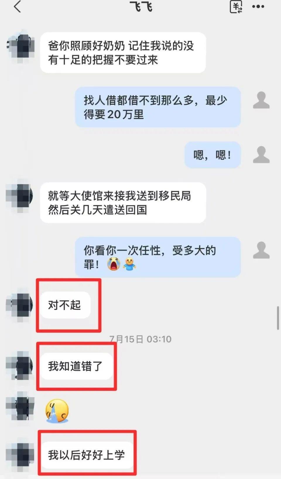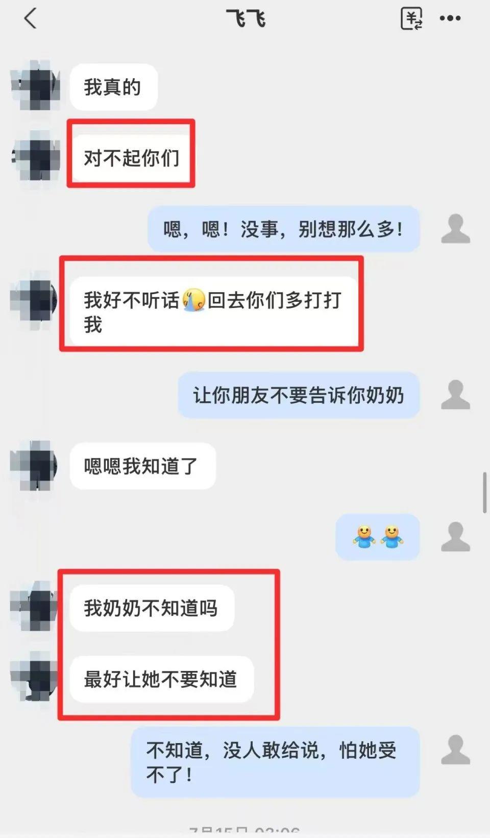 “孩子多次向我道歉,说自己不听话导致这个结果,说自己想回家好好上学,还说注意不要告诉他奶奶,怕老人受不了。”蔚先生说,7月15日小飞再次联系他,称自己是借的手机偷偷发消息,说此前自己没有及时删除对外交流信息被管理员发现,遭到对方殴打。