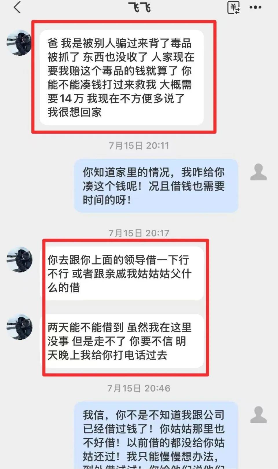 “但之后的一些说法,我就觉得不像是我孩子说的了。”蔚先生称,15日小飞发来的一条信息称:“爸,我是被别人骗过来背了毒品被抓了,东西也没收了,人家现在要我赔这个毒品的钱就算了,你能不能凑钱打过来救我,大概需要14万元,我现在不方便多说了,我很想回家。”