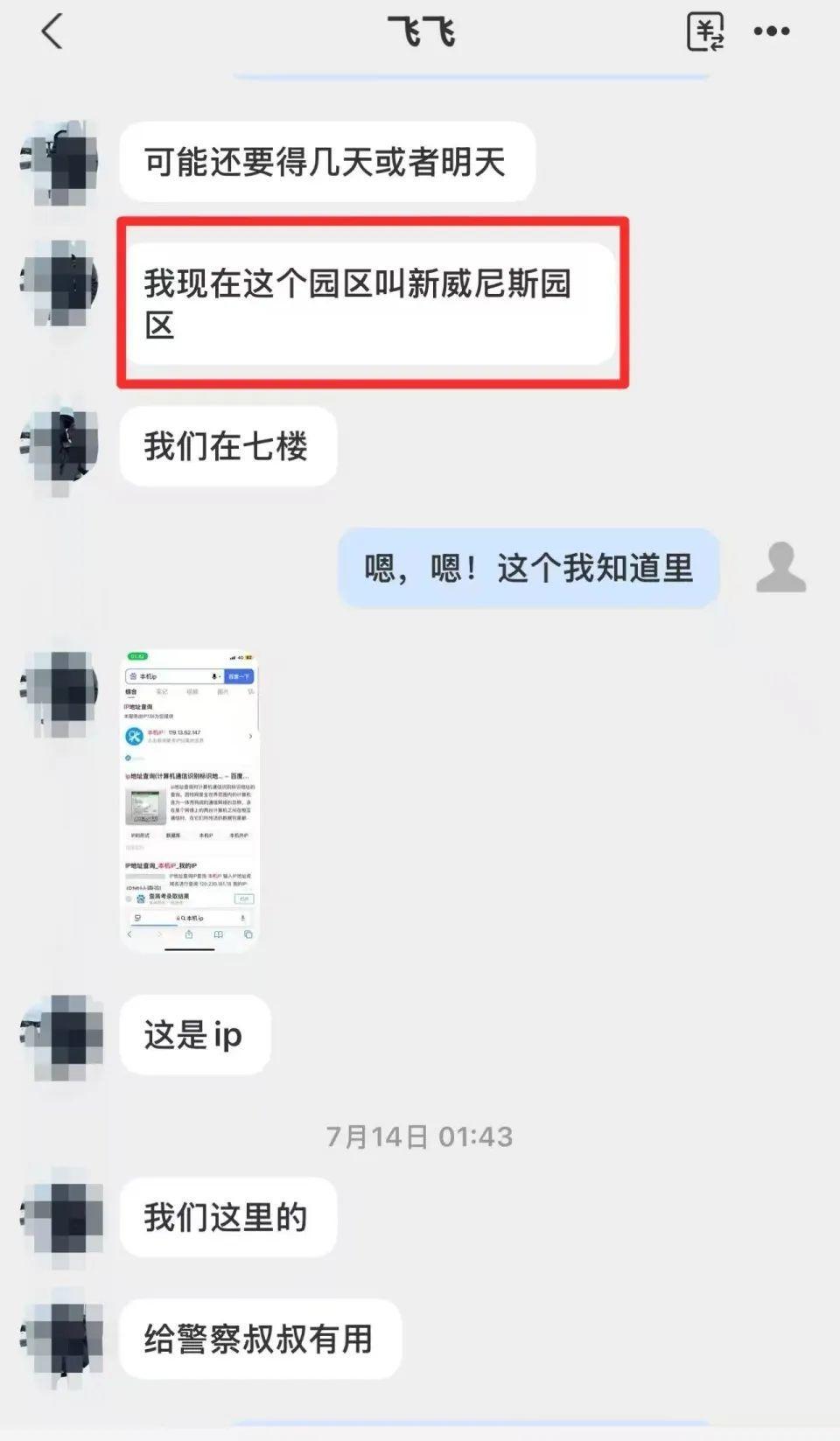 7月10日凌晨1点多,他突然接到孩子使用支付宝跟他联络的信息,“孩子说自己被人骗到了柬埔寨的一个园区里面了,那个园区叫新威尼斯园区。”蔚先生说,当日,他赶紧到自己工作地派出所报警,但警方称需要到孩子工作地派出所报警。