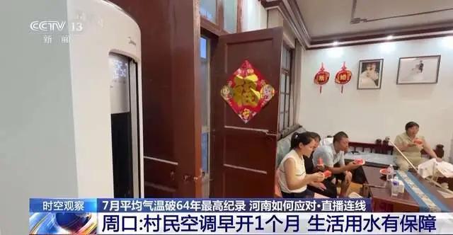 记者来到河南周口市西华县思都岗村的一户农家院,看到这家农户的空调正在全力运转,给村民降温解暑。这家农户告诉记者,他们家的空调在今年6月份收麦子的时候就已经开了,比往年要早一个月的时间,而且每天开的时间也比较长。