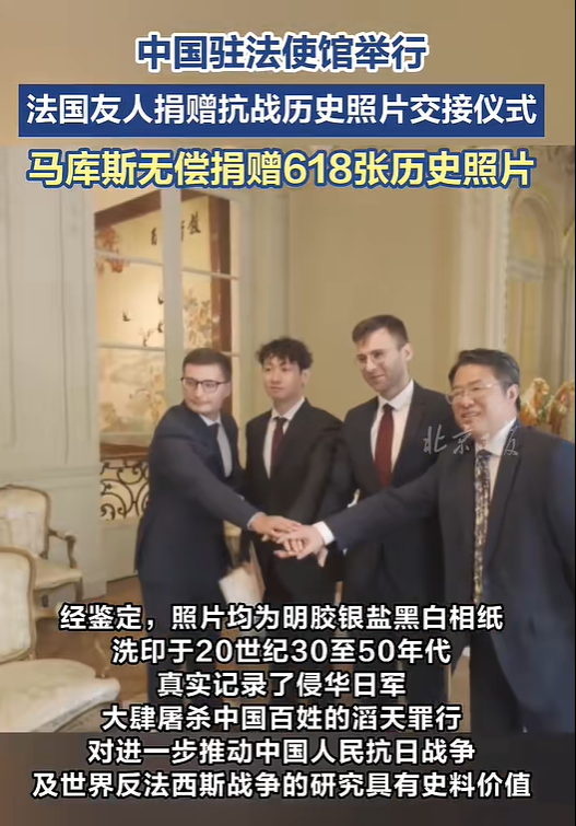 8月5日,据新华社消息:中国驻法国大使馆4日举行法国友人马库斯·德雷特斯向中方捐赠抗战历史照片交接仪式。
