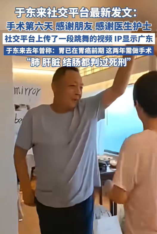 8月4日,胖东来商贸集团董事长于东来发视频称:手术第六天,感谢朋友,感谢医生护士。同时还上传了一段与妻子跳舞的视频,IP显示广东。