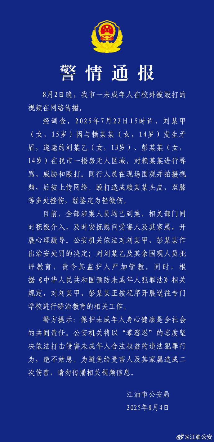 四川绵阳江油市公安局8月4日发布警情通报称,8月2日晚,江油市一未成年人在校外被殴打的视频在网络传播。经调查,2025年7月22日15时许,刘某甲(女,15岁)因与赖某某(女,14岁)发生矛盾,遂邀约刘某乙(女,13岁)、彭某某(女,14岁)在江油市一楼房无人区域,对赖某某进行辱骂、威胁和殴打。同行人员在现场围观并拍摄视频,后被上传网络。殴打造成赖某某头皮、双膝等多处挫伤,经鉴定为轻微伤。