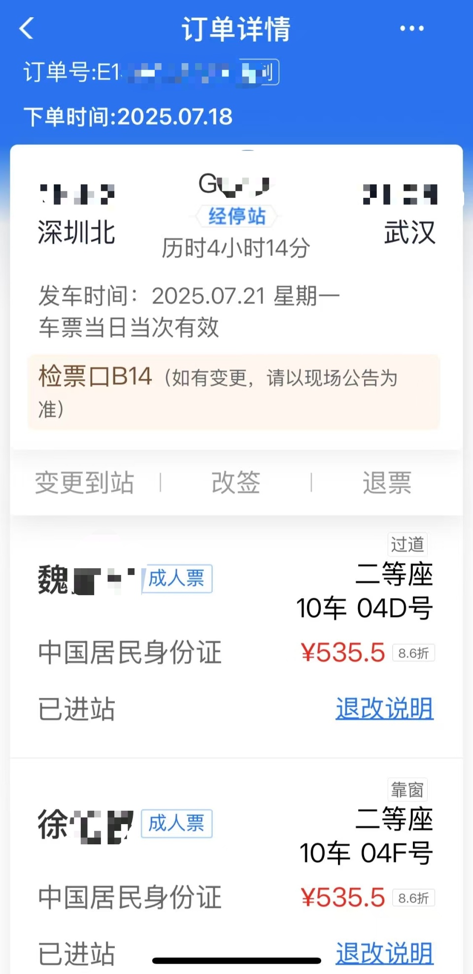8月5日上午8时许,华商报大风新闻记者联系到了徐先生的妻子魏女士,魏女士回忆,7月18日购票时,因徐先生临时有事,她便通过自己的12306账号,为夫妻二人购买了7月21日的高铁车票。“我在添加老徐为乘车人时,系统并未像他本人操作时那样弹出‘轮椅重点旅客’提示或进行相关询问,我们便按照此前购票的经验,误以为系统给老徐分配的车票便是残疾人专座。”魏女士提供的购票信息显示,系统为两人分配了10号车厢的座位(10车04F和相邻座位)。