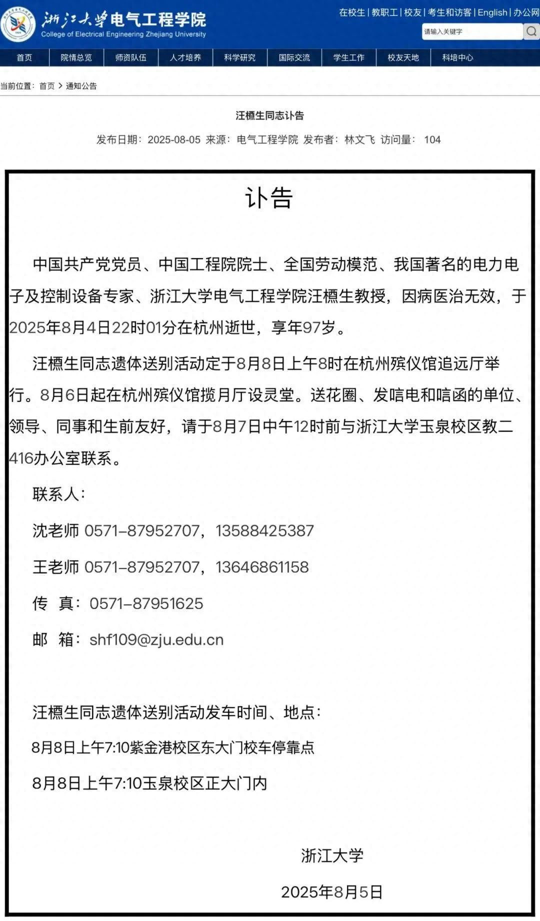中国共产党党员、中国工程院院士、电力电子及控制设备专家、浙江大学教授汪槱生同志,因病医治无效,于2025年8月4日在杭州逝世,享年97岁。