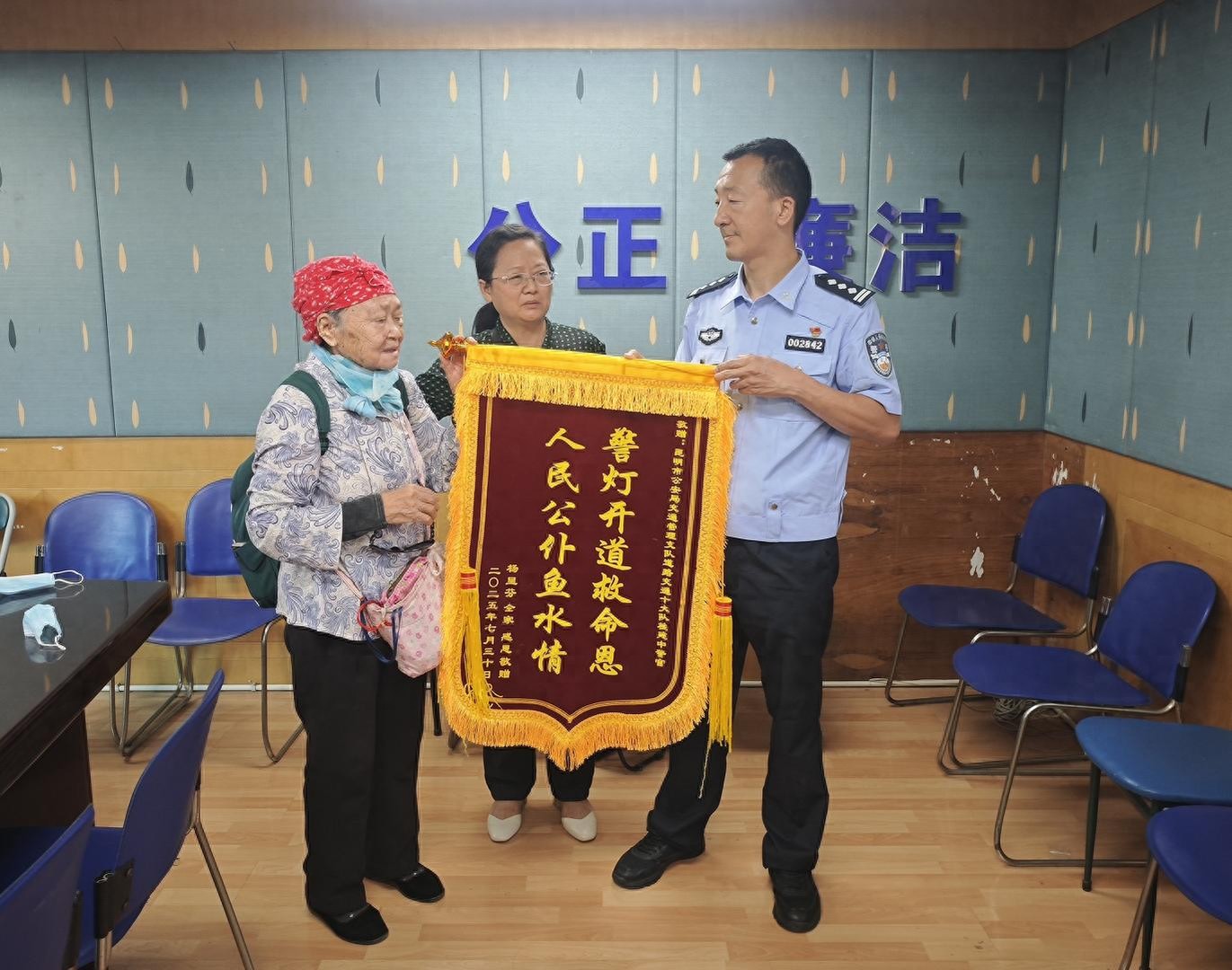 8月1日上午,82岁的老人杨显芬在女儿的陪伴下,来到昆明市公安局交通管理支队,将印制有“警灯开道救命恩 人民公仆鱼水情”的锦旗交到十大队民警桂建中手中。锦旗上的十个字,是老人在5年前未来得及对桂建中说出的感谢。