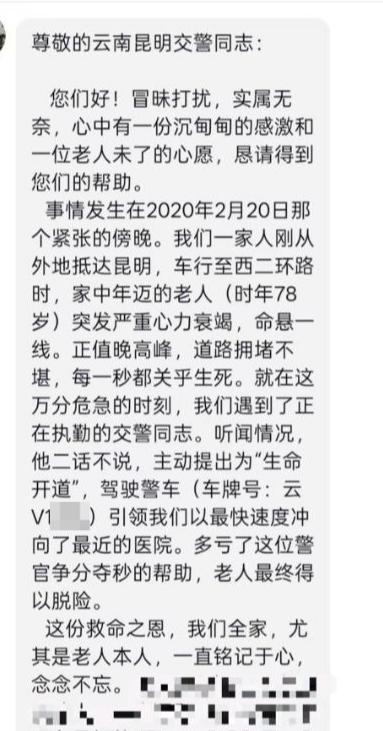 “尊敬的云南昆明交警同志,您们好!冒昧打扰,实属无奈,心中有一份沉甸甸的感激和一位老人未了的心愿恳请得到您们的帮助。”今年7月19日,为了再见到曾经帮助过自己的民警,杨显芬给“云南交警”抖音账号发送了一条长达927字的私信。杨显芬在私信中提到,想通过一个警号和一个车牌号,寻找5年前在自己病危时刻伸出援手,用警车紧急开道送医的交警,只为当面郑重地表达感谢。
