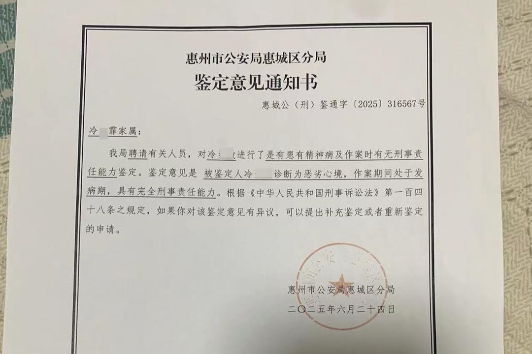 为了解哥哥的作案动机,事发后,冷先生申请对冷某敏做了两次精神鉴定。4月9日,惠州市公安局惠城区分局出具的鉴定意见通知书显示,冷某敏首次鉴定为“重度抑郁症发作,不伴有精神病症状”,作案时处于疾病的发病期,自知力完整,作案时的辨认能力和控制能力完整;第二次,6月24日,冷某敏被鉴定为“恶劣心境”。鉴定书指出,两次鉴定结果冷某敏均处于发病期,涉嫌故意杀人的行为均评定为“完全刑事责任能力”。