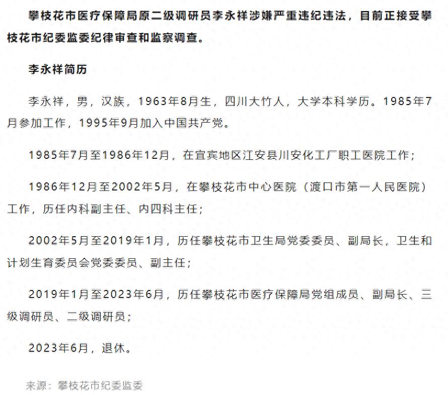 攀枝花市医疗保障局原二级调研员李永祥涉嫌严重违纪违法,目前正接受攀枝花市纪委监委纪律审查和监察调查。