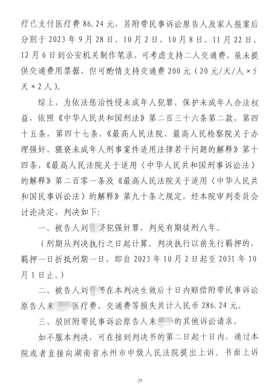 2025年7月24日,永州中院作出二审判决,维持一审定罪和附带民事判决,撤销一审量刑,以强奸罪判处刘某赟有期徒刑六年。