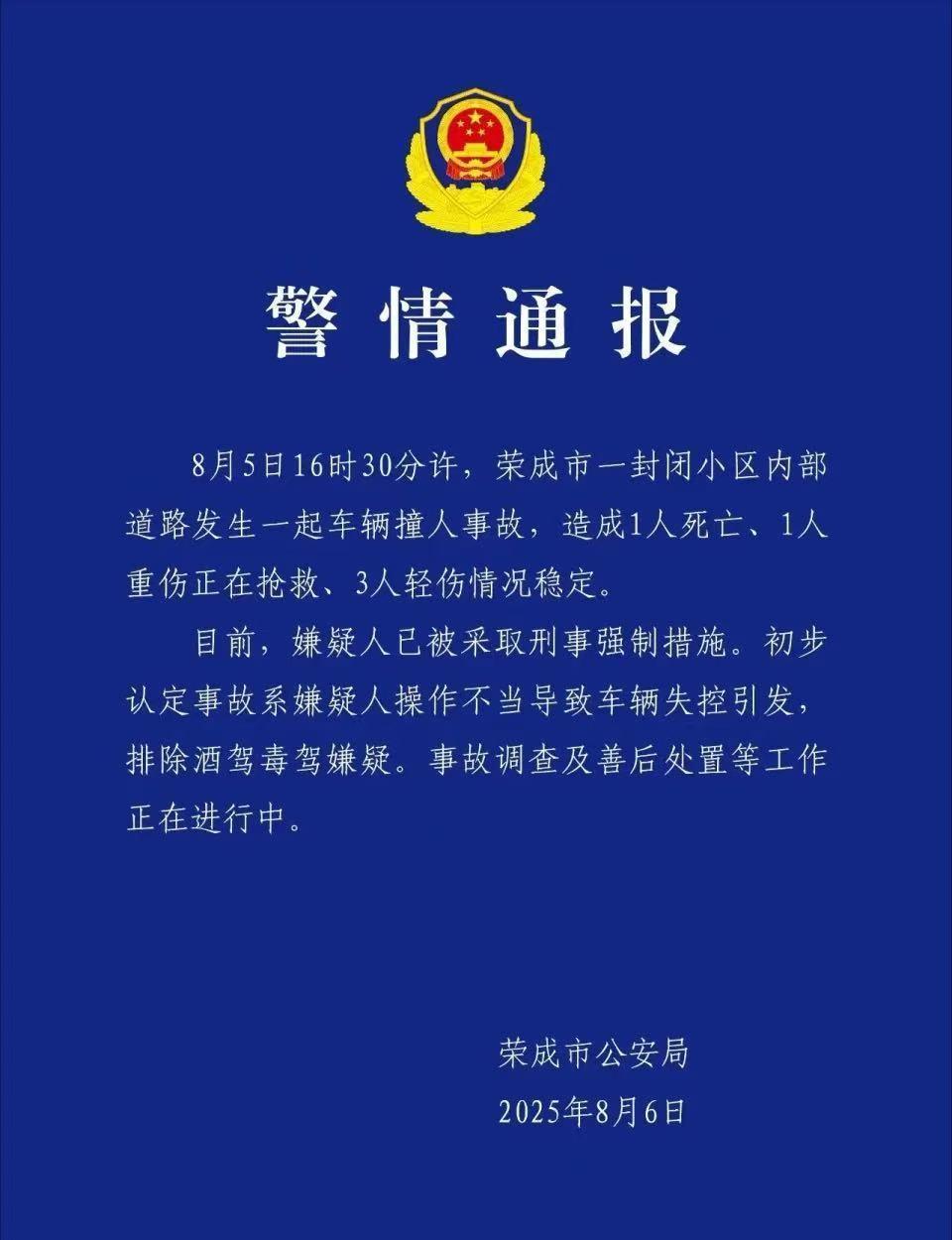 8月5日16时30分许,山东荣成市一封闭小区内部道路发生一起车辆撞人事故,造成1人死亡、1人重伤正在抢救、3人轻伤情况稳定。