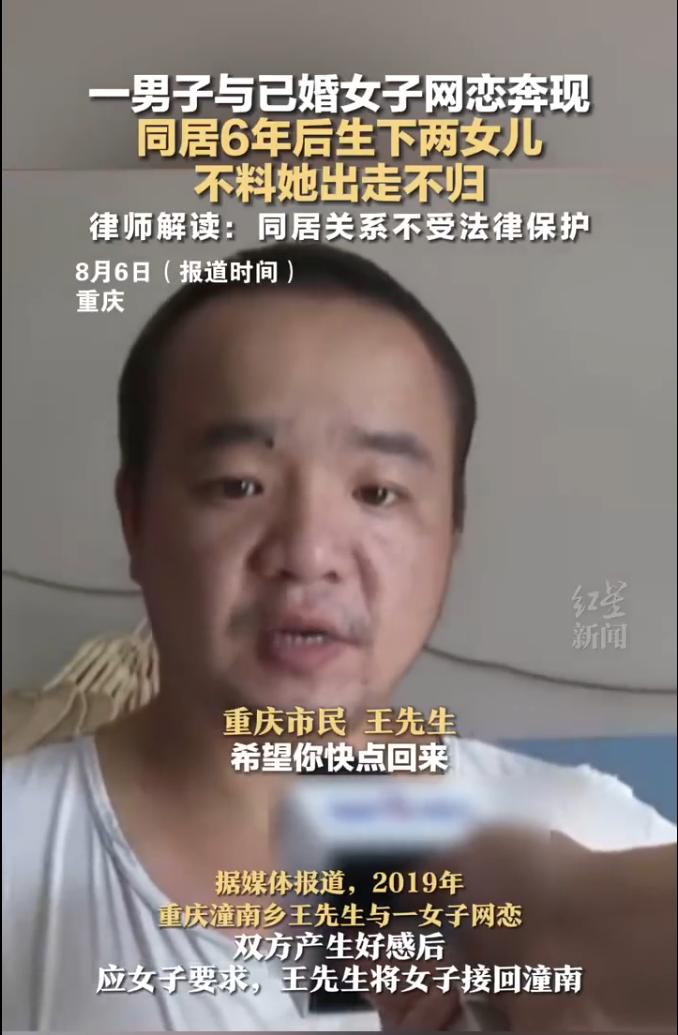 2019年重庆潼南乡,王先生与一女子网恋,双方产生好感后,应女子要求,王先生将女子接回潼南。接回家不久,女子的母亲和丈夫找到王先生,他才得知女子已婚,将女子送回。但女子又独自打车回到王先生家,自此女子娘家和丈夫没再找上门来。王先生和女子开始了同居生活,期间生下两个女儿。