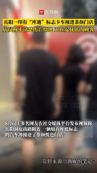 8月6日,多名网友在社交媒体平台发布视频称,岳阳洞庭南路附近,一辆印有“库迪”商标的小型卡车冲撞进了茶颜悦色门店。