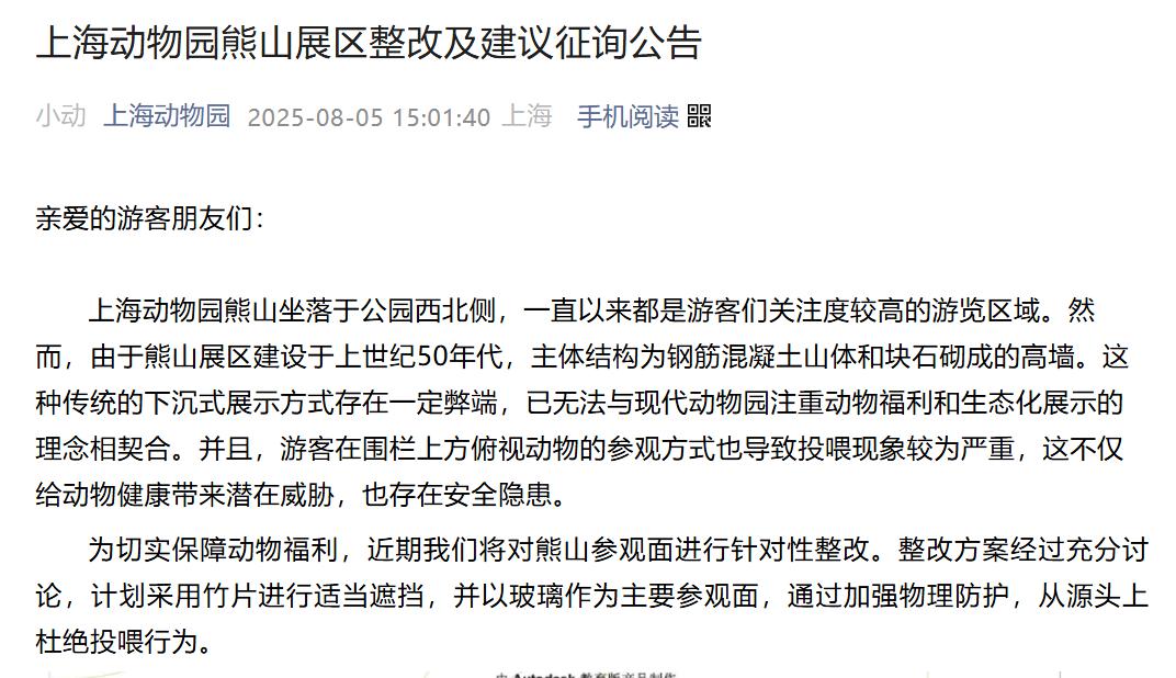 上海动物园昨天(8月5日)发布熊山展区整改及建议征询公告