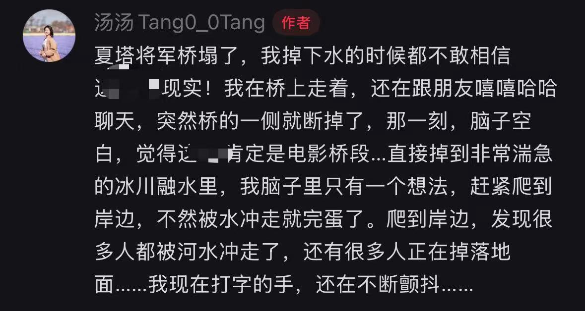 同时有网友发视频表示,自己从桥上摔下,“我在桥上走着,还在跟朋友嘻嘻哈哈聊天,突然桥的一侧就断掉了”“直接掉到非常湍急的冰川融水里,我脑子里只有一个想法,赶紧爬到岸边,不然被水冲走就完蛋了。爬到岸边,发现很多人都被河水冲走了,还有很多人正在掉落地面。”