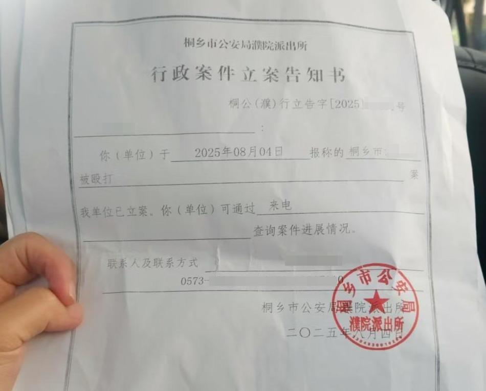 文女士还说,自己被打后身体出现不适症状,请了病假前往医院就诊,并向当地派出所报警,警方当天已立案。文女士出示的行政案件立案告知书显示,桐乡市公安局濮院派出所于8月4日已就文女士被殴打案立案。