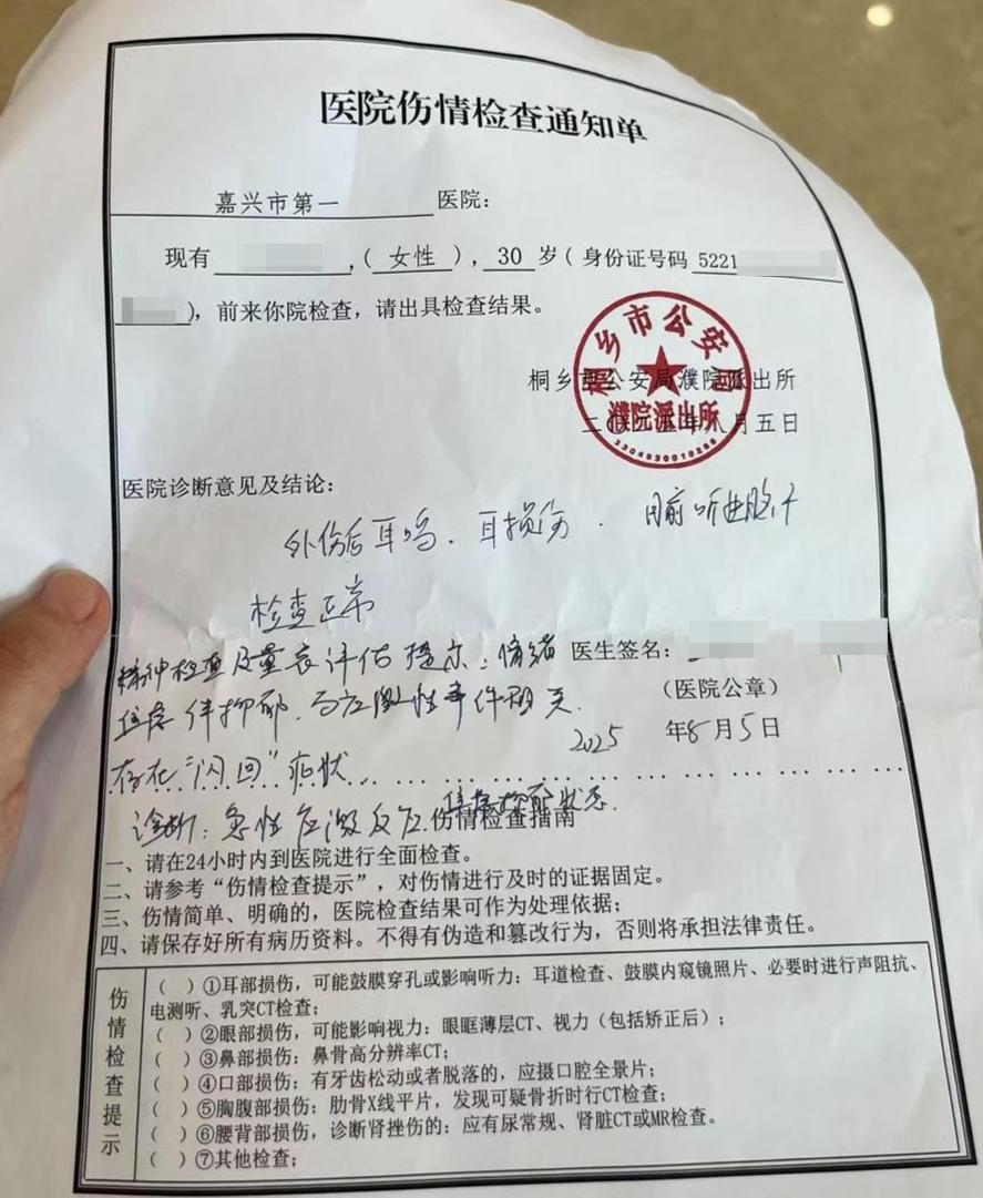 文女士出示的一份抬头为“嘉兴市第一医院”的医院伤情检查通知单显示,8月5日的诊断意见和结论是:外伤后耳鸣,耳损伤,目前脑干检查正常;精神检查及量表评估提示;情绪焦虑伴抑郁,与应激性事件相关,存在“闪回”症状。诊断为“急性应激反应,焦虑抑郁状态”。