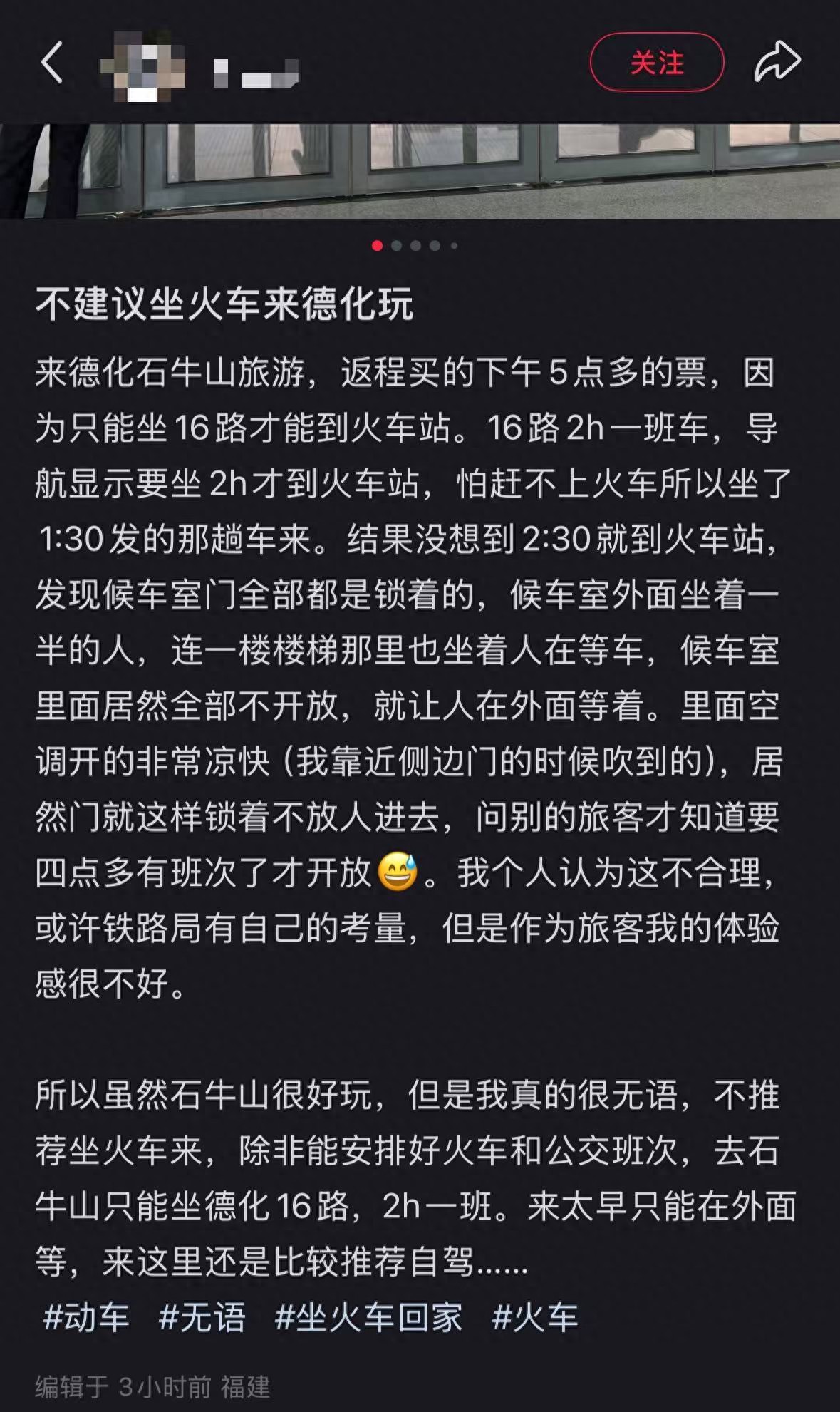 网友在帖中表示,“下午2:30就到(德化)火车站,发现候车室门全部锁着,候车室外面坐着一半的人,连一楼楼梯那里也坐着人在等车,里面空调开的非常凉快(我靠近侧边门的时候吹到的)”,网友还称“我个人认为这不合理。”
