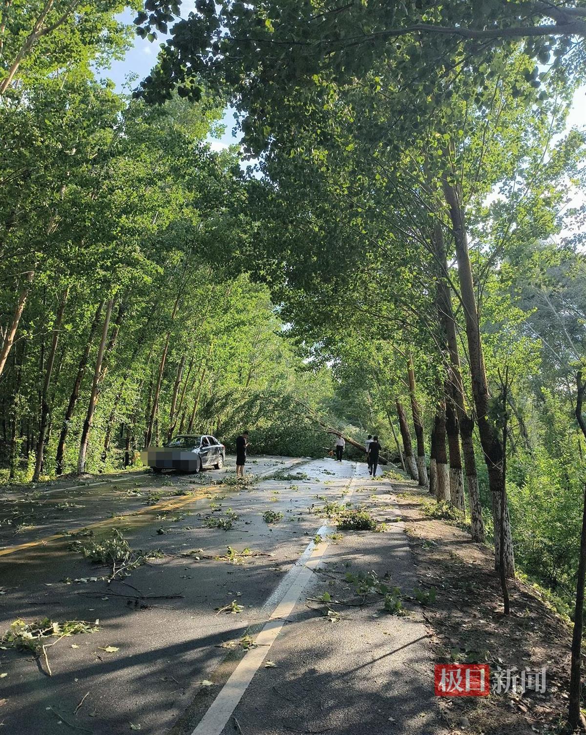 该网友发文称,6日下午,他驾车经过水泉村四道沟附近路段,天空突降暴雨,外面风力很大,道路两侧的树木被风吹断倒在路面上。暴雨过后,该道路被残枝树叶覆盖,一片狼藉。