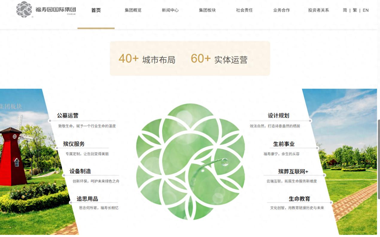 福寿园官网显示,其涵盖公墓运营、殡仪服务、追思用品、殡葬互联网+等板块业务,业务覆盖19个省、自治区、直辖市的四十余个城市。