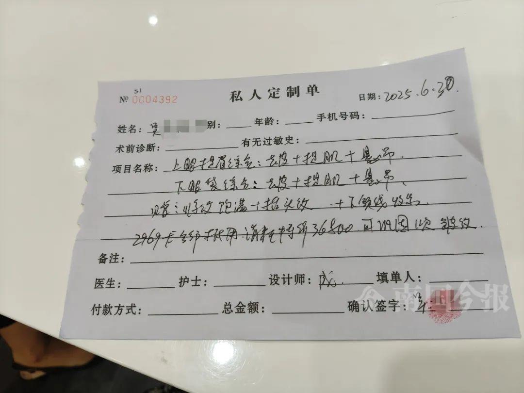 两人极力劝说,刘女士还主动说帮吴垫10000元。“我被她俩洗脑诱导后同意做此项目。”吴女士说,当时手术是半麻的,大概做了两个小时,她都是昏沉状态。