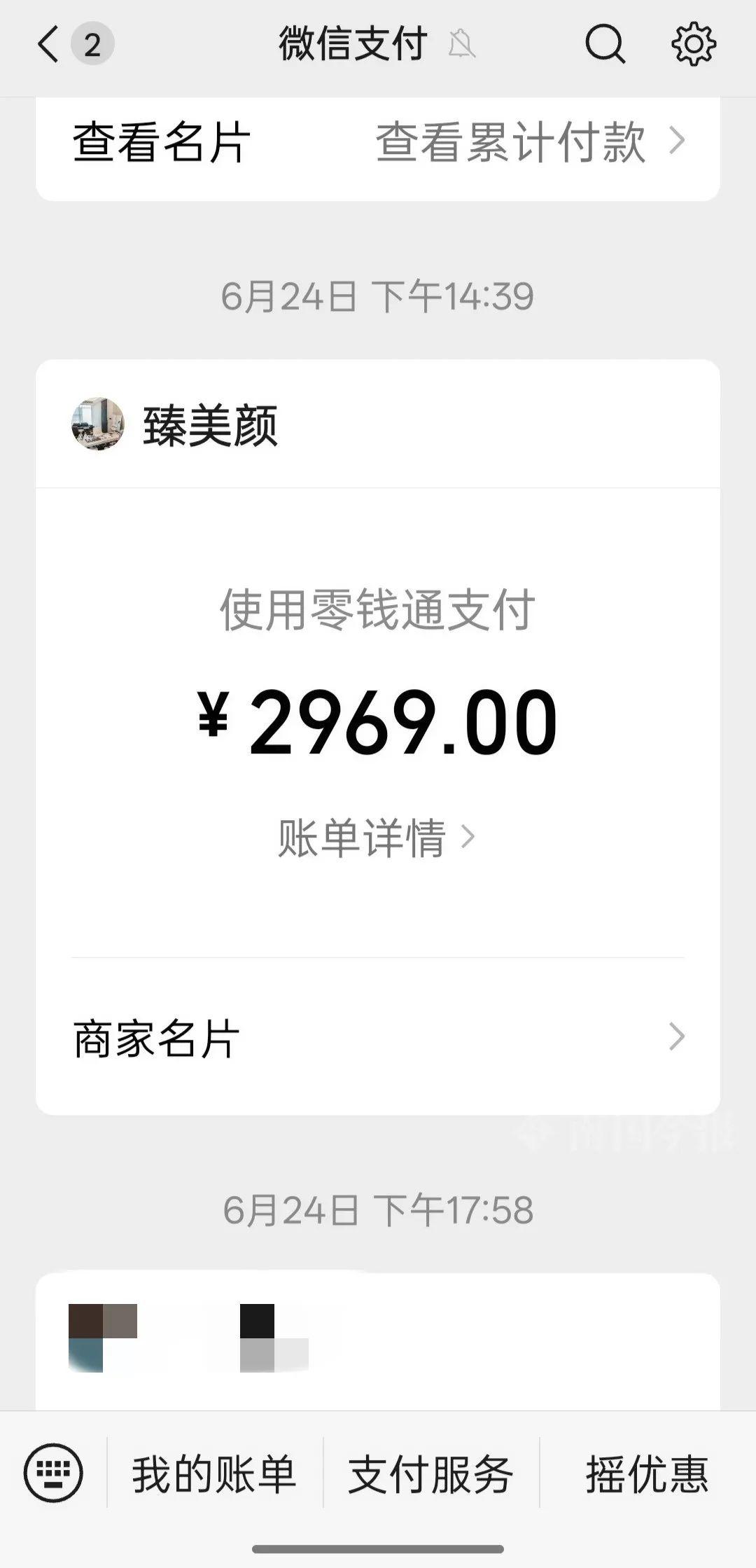 吴女士说,今年6月24日,她在柳州市华达苑沿街的“丽雨特色美容”做项目,一名叫乐乐的推销员在宣传只需花费29.9元,就可以做两次“脸部提升”的美容项目。吴女士觉得价格可以,便花钱参与体验。体验期间,在乐乐和美容院老板娘的推销下,吴女士又花了2969元购买项目。对方告诉她,项目需要到南宁市的广西艾伽医疗美容有限公司去做。