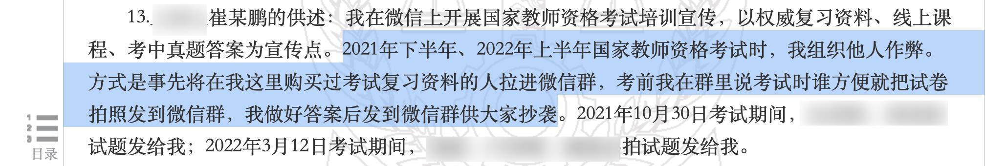 黑龙江省大庆市中级人民法院出具的刑事裁定书中,证人杨某某的证言称,2022年3月12日国家教师资格考试时,为了让崔某鹏将做好的答案发到“2022上半年《资格证》笔试逢考必过”微信群内,其主动将试题拍照发到微信群内。在其准备抄崔某鹏发送的答案时,被监考老师发现并驱逐出考场。同年5月,崔某鹏打电话说考试作弊的事可能被警察找,让其把补课班的微信群聊记录删除。
