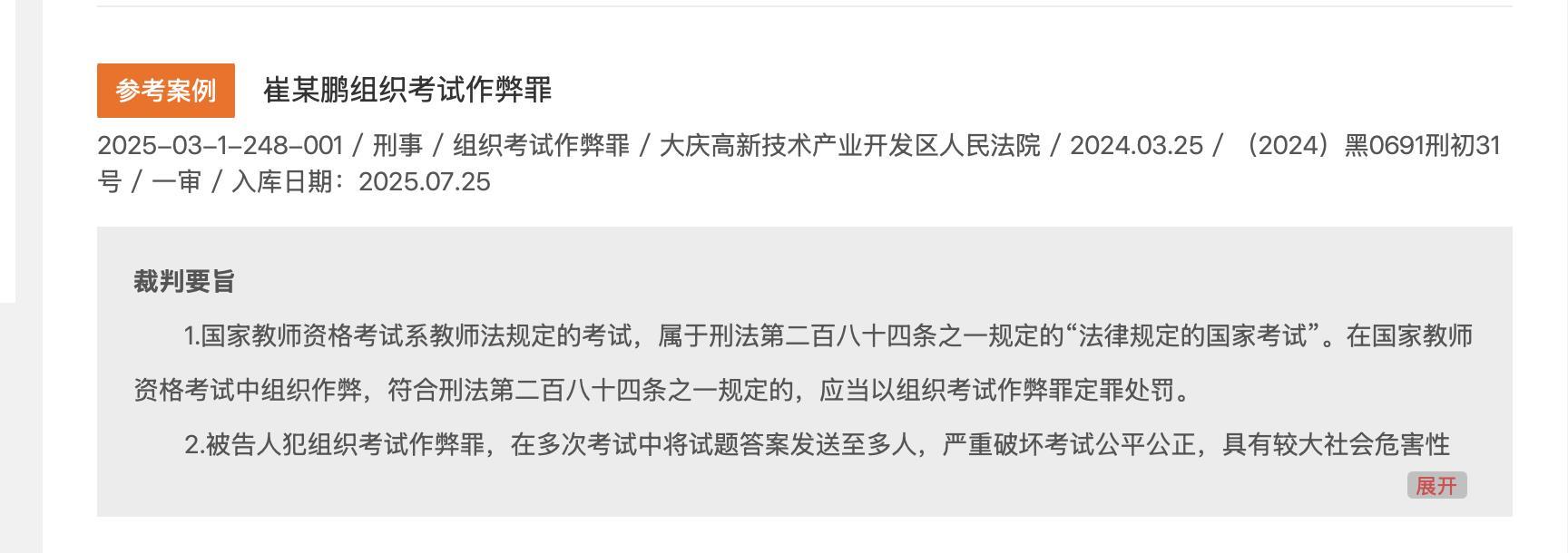 极目新闻记者注意到,崔某鹏组织考试作弊罪于2025年7月25日被收录至人民法院案例库。他组织考试作弊的事实如下: