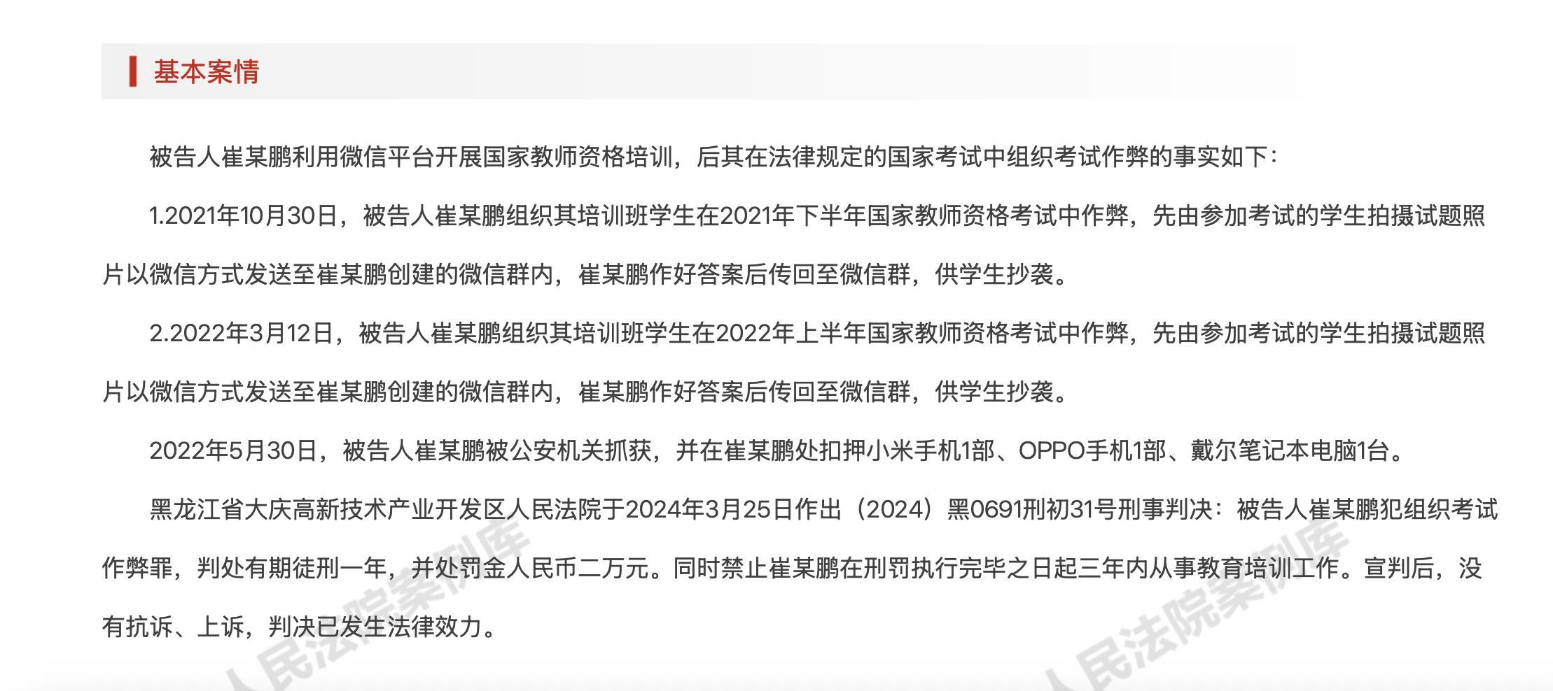 据悉,黑龙江省大庆高新技术产业开发区人民法院于2024年3月25日作出(2024)黑0691刑初31号刑事判决:被告人崔某鹏犯组织考试作弊罪,判处有期徒刑一年,并处罚金人民币二万元。同时禁止崔某鹏在刑罚执行完毕之日起三年内从事教育培训工作。