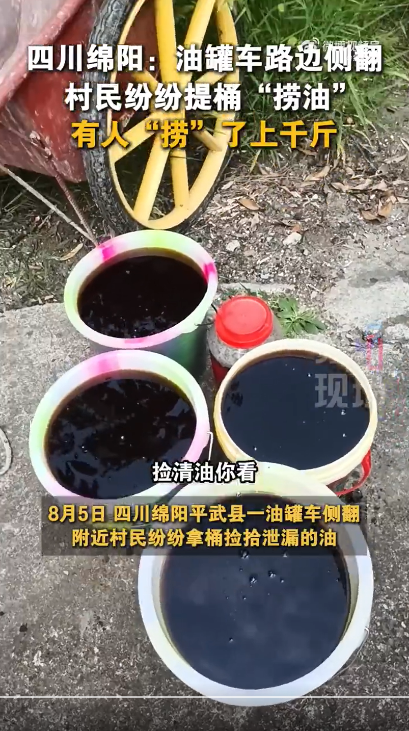 8月5日,四川绵阳平武县一油罐车侧翻,附近村民纷纷拿桶捡拾泄漏的油。有目击村民告诉@第一现场记者,现场很多人捡油,有人甚至捞了1000多斤。车上装的是菜籽油,司机是否放弃这些油尚不清楚。