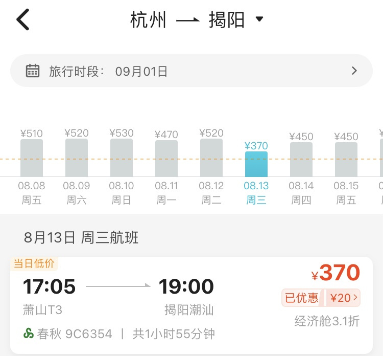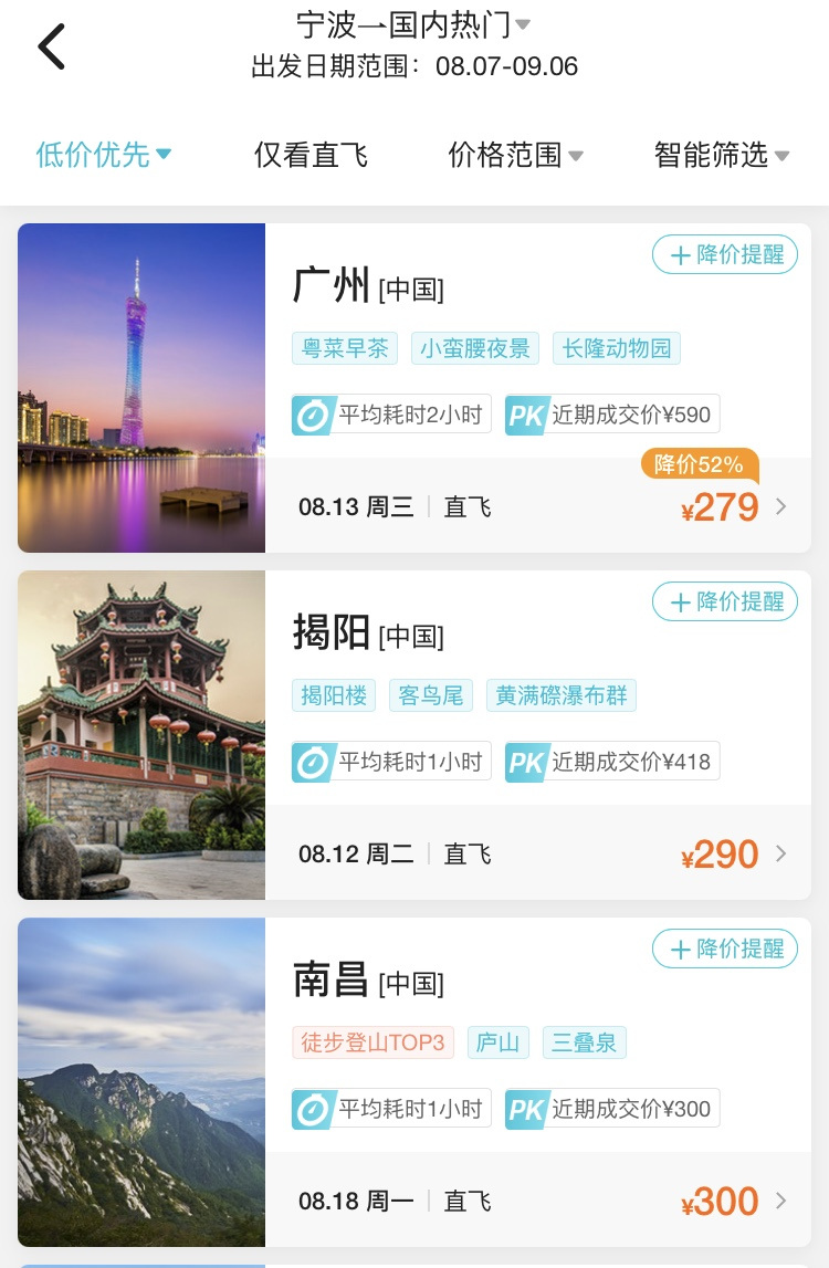8月中旬,宁波飞广州、揭阳的机票价格2字头就可拿下,比如8月13日宁波飞广州最低票价仅需279元(不含税),8月12日宁波直飞揭阳机票价格最低仅需290元(不含税)。