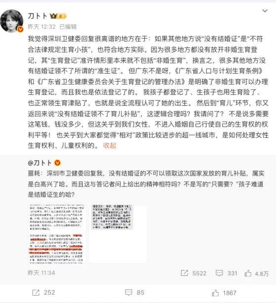 刀卜卜进一步表达了对上述回复的不解,因为根据《广东省人口与计划生育条例》和《广东省卫生健康委员会关于生育登记的管理办法》,明确了非婚生育可以办理生育登记。“我也是依法登记了的。我孩子都登记了,生孩子也用生育险了,也正常领生育津贴了,也就是说全流程认可了她的出生。”