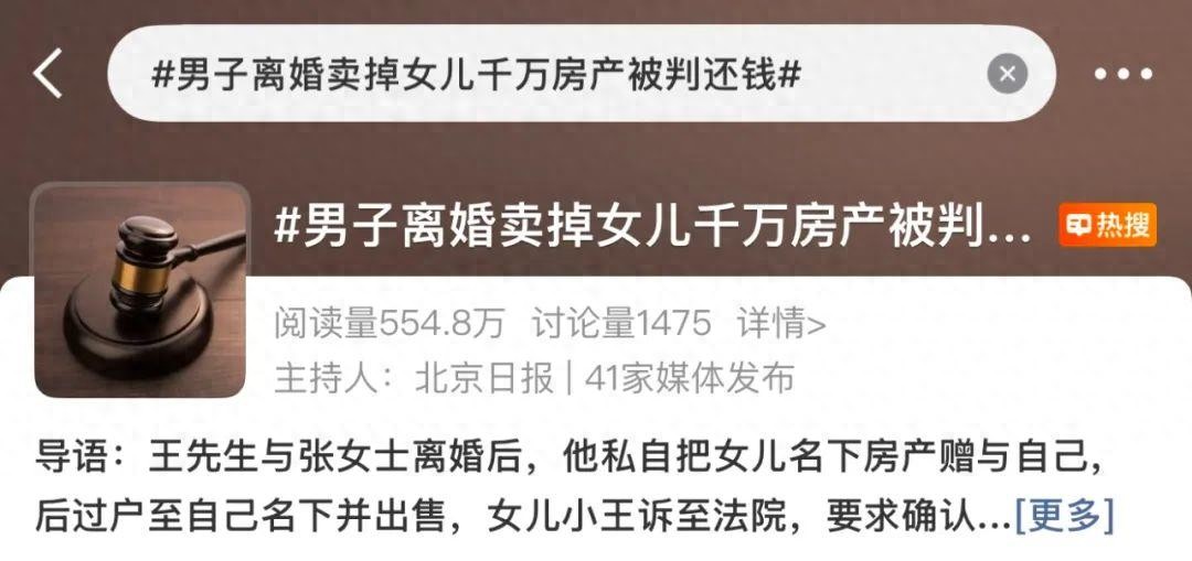 今天,#男子离婚卖掉女儿千万房产被判还钱#的话题冲上微博热搜。