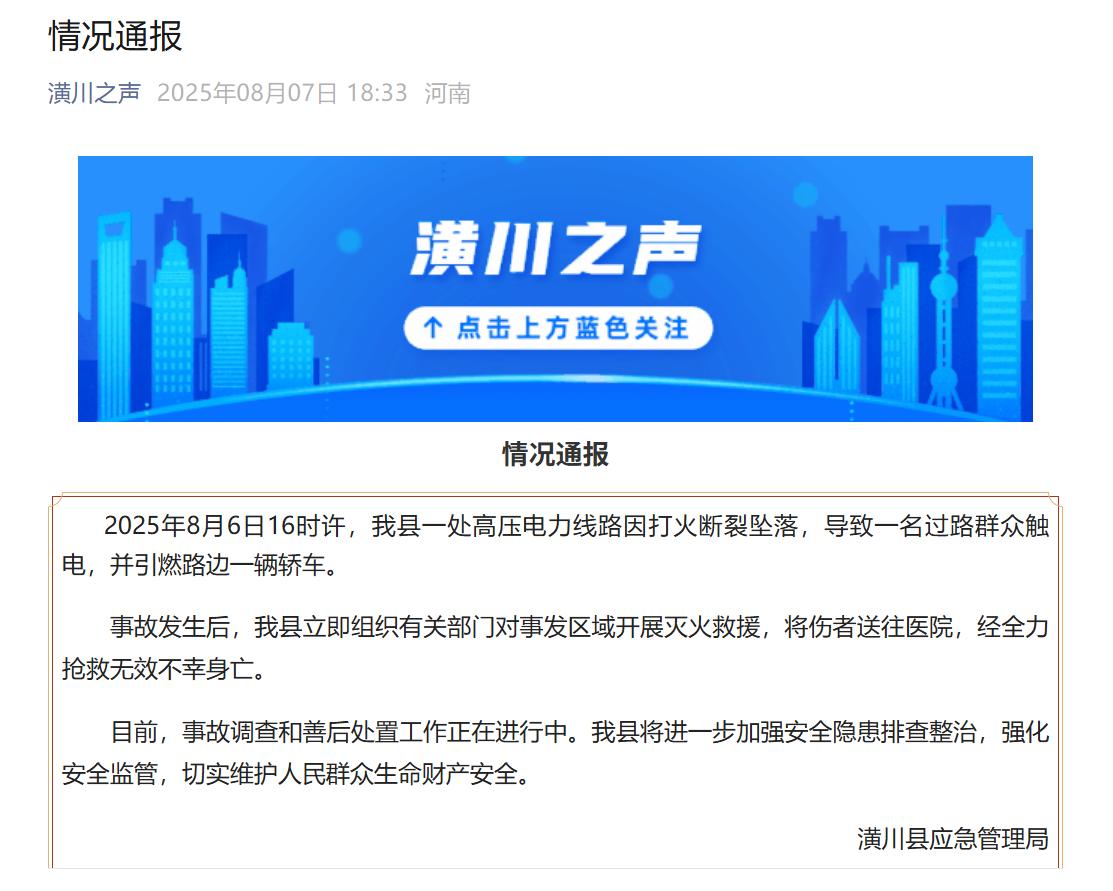 8月7日,河南潢川县应急管理局通报:2025年8月6日16时许,我县一处高压电力线路因打火断裂坠落,导致一名过路群众触电,并引燃路边一辆轿车。