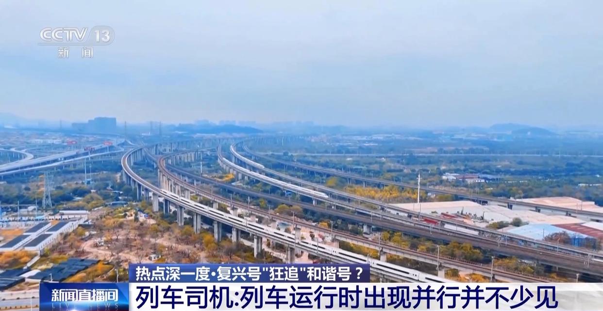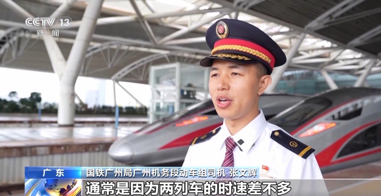 国铁广州局广州机务段动车组司机 张文辉:通常是因为两列车的时速差不多,并行的线路又比较长,就会出现这样并驾齐驱的场面。