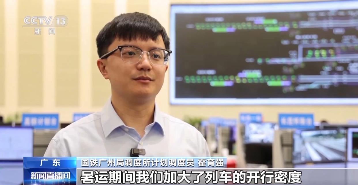 国铁广州局调度所计划调度员 霍育强:暑运期间我们加大了列车的开行密度,加开了144列临时旅客列车。而当多列动车组在同一时段运行时,这种同框的场景也就常出现了。