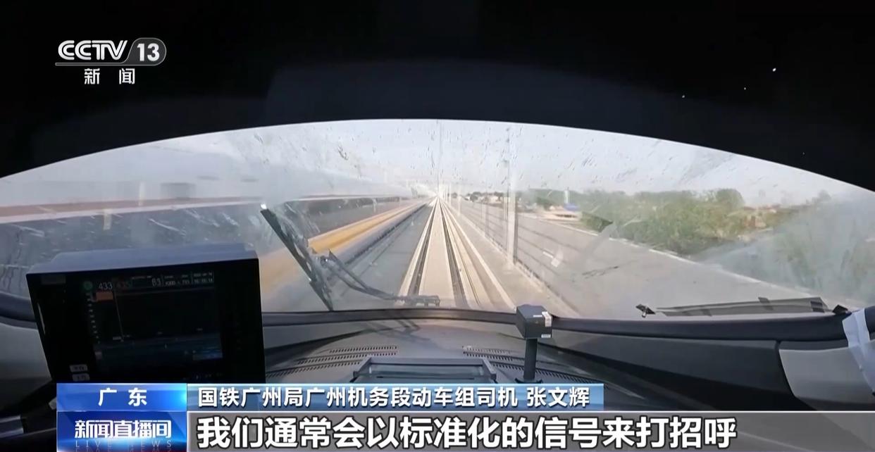 国铁广州局广州机务段动车组司机 张文辉:如果两列车恰巧出现在同一个区段,时间、速度又差不多的话,我们通常会以标准化的信号来打招呼,比如在非限鸣区段鸣一声笛,这是我们一种默契的问候。