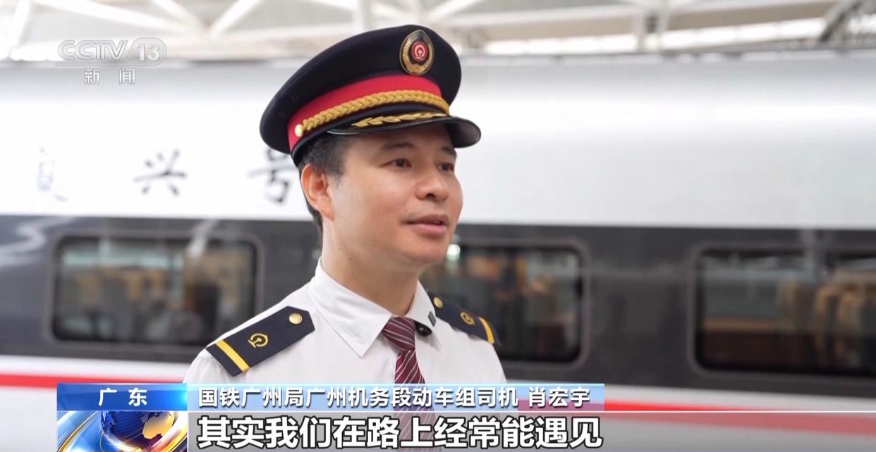 国铁广州局广州机务段动车组司机 肖宏宇:其实我们在路上经常能遇见,但是我们高铁司机要始终盯住线路前方,而且保持不间断瞭望。高铁列车运行速度很快,而且气流对视觉有干扰,加上车窗玻璃有防眩光处理,所以我们看不见对方的脸,就更不知道对方是谁了。